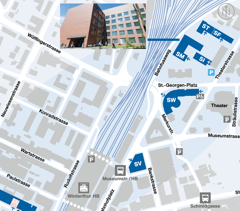 The SM-building of the university is located at the ZHAW university campusis next to the train station and can be reached on foot in 2 minutes.